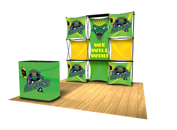 Kit D Xpressions Express: Improvement in the trade show exhibit business seems to come in spurts, but with the introduction of high speed dye sublimation printing equipment, the Xpression's Snap three dimensional graphic system, has become an instant success story. All of us are so used to the pop up frames that have graphic panels that are hung as large graphic image panels from the top hubs, however this is totally different because the skins are attached one by one.