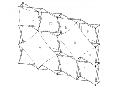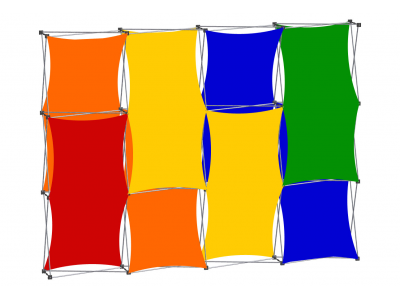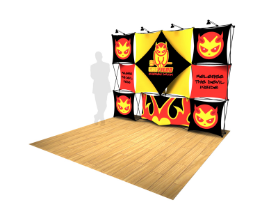 4x3 M Xpressions XSNAP Pop Up DisplayImprovement in the trade show exhibit industry seems to come in spurts, but with the advent of high speed dye sublimation printing equipment, the Xpression's Snap 3-D graphic system, has become an immediate success story. When you first see the Xpression's Snap display, you recognize that the system is very flexible insofar as the individual skins are able to be connected to multiple hubs, and having the ability to attach skins from the front hubs to the back hubs is a huge design bonus.