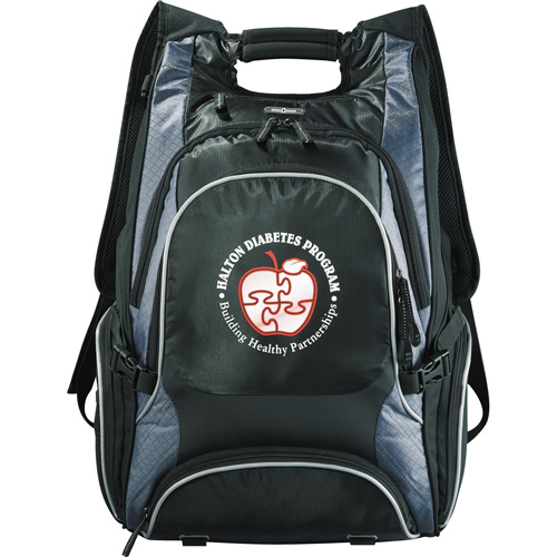 Zippered main compartment holds your laptop and includes padded compartment for your iPad or tablet. Large front zippered pocket has organization and earbud access. Features two side pockets. Adjustable backpack straps and carry handle.