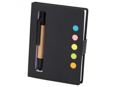 Five assorted color sticky flags. Includes a black ink mini-ballpoint pen. Includes 80 ruled page perforated notepad. Pen imprint not available.