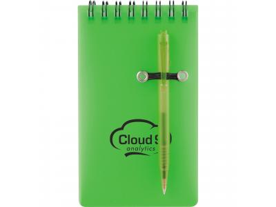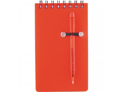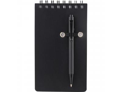 Spiral jotter with matching mini ballpoint pen. Flip cover with elastic pen loop. Pen imprint not available. Pens packed separately.
