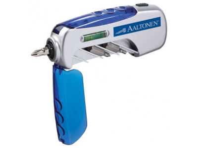 3-foot metal tape measure with standard and metric measurements. Built-in level. 6 screwdriver bits (2 hex, 2 flathead, 2 Phillips-head). Single white LED light with on/off switch. Magnetic base.