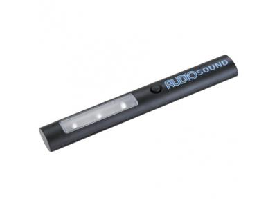 3 white LED flashlight with 2 settings: steady and flashing light. Push button to turn power on/off. Includes 2 piece magnet on the back.