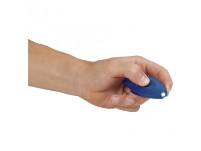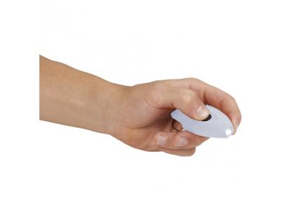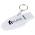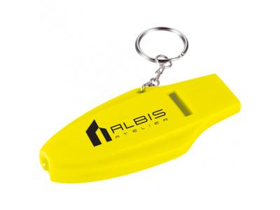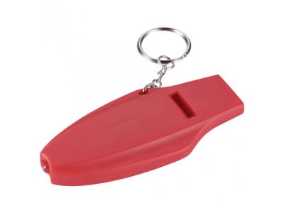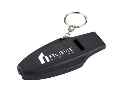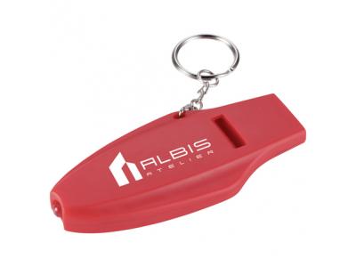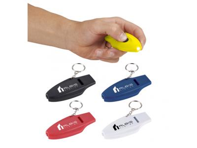 Single white LED light with whistle function and metal split key ring. Squeeze power button to turn on light.