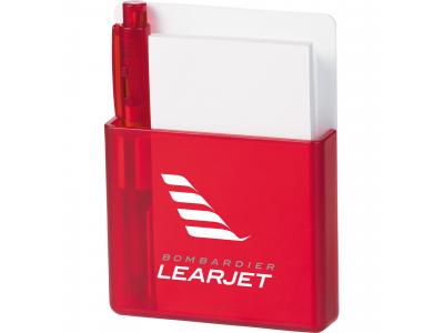 Notepad and pen. Detachable clip on back fits conveniently in the air vent of a car. Pen not available for imprint.