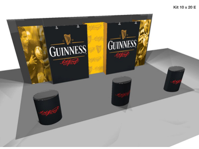The 20’ VBurst Pop Up Displays Kit E has one 1 x 3 straight frame recessed back a foot with two 10' curved frame pop ups positioned on either side; all frames fully covered with full color dye sublimation graphics.