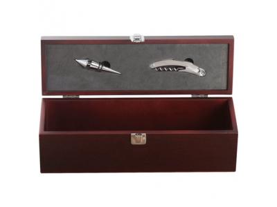 Rich, polished cherry wood case turns a bottle of wine into a memorable gift. Includes a stainless steel stopper and corkscrew / bottle opener with foil seal cutter located in lid.