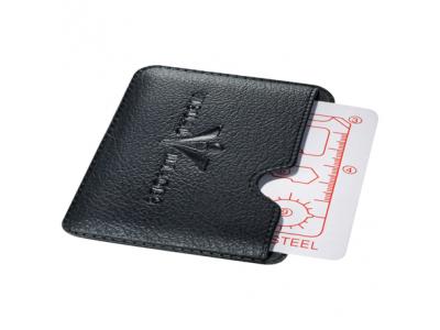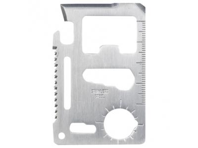 A 15-in-1 multi tool slim enough to fit in your wallet. Ready to be used whenever needed. The tool features a can opener, knife edge, screwdriver, ruler, can opener, 4 wrench sizes, butterfly wrench, saw blade, direction ancillary indication, 2 position wrench, and lanyard hole. Black pouch included.
