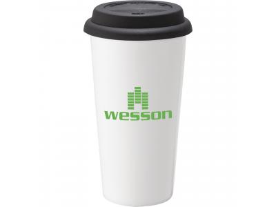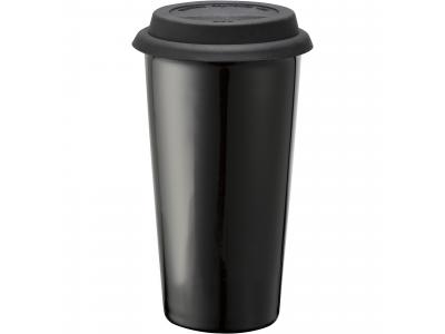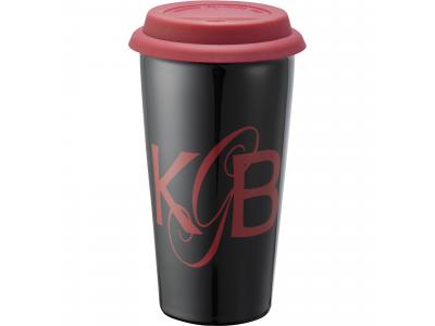 Silicone lid. Double-wall ceramic tumbler. 6.5" tall without the lid. 15 oz. Microwave Safe. Remove silicone lid before placing in the microwave. 15oz.