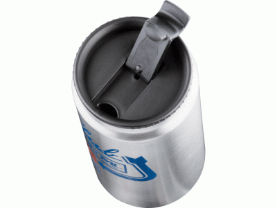 Double-wall vacuum insulated stainless steel can tumbler. Plastic spill proof screw-on lid with flip-top function. Useful for both cold and hot liquids. 12oz.