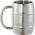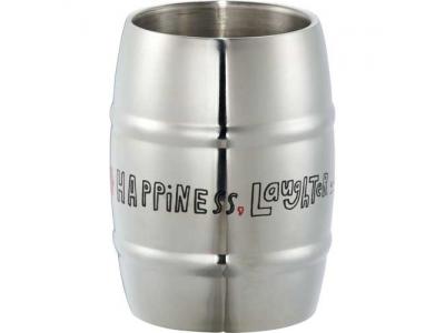 Ready for a refill? Double-wall stainless steel barrel mug will keep beverages at desired temperature. Stainless steel handle. 14oz.