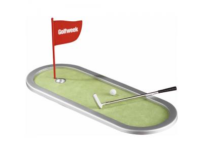 Desktop golf game includes miniature putter, golf ball, and felt putting green with flag stick. Leed's products are not designed for use by, or intended for children ages 12 and under.
