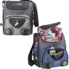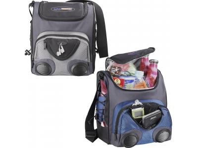 Zippered leak-proof main compartment holds up to 20 cans. Features water-resistant speakers compatible with most CD and MP3 players (including iPods and iPhones). Side shock cords. Uses four AA batteries (not included). Insulated PEVA lining.