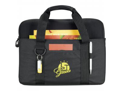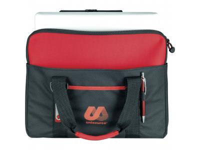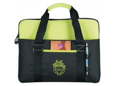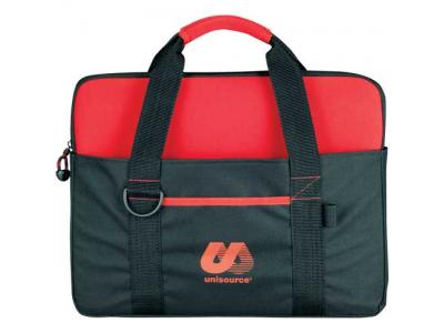 Removable main zipped compartment holds most 15" laptops and removes from sleeve. Sleeve has front open pocket, D-ring and pen loop with comfort grip carry handles.