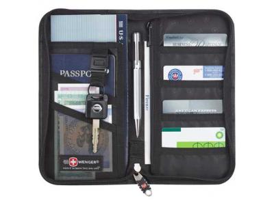 Interior pockets for passport, tickets, and travel itineraries. Elastic loop for pen or small, electronic devices. Four card slots. Hidden interior zippered organizer. Detachable key ring. Mesh ID pocket. Leather handle. Signature Swiss Army hardware and lining.