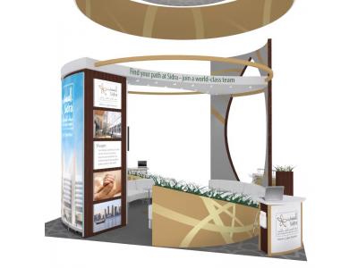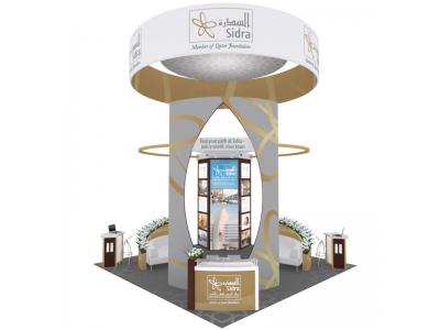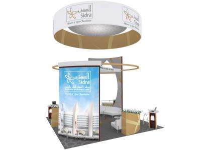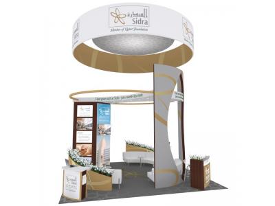 Go from being "striking" on the show floor, to "stunning" with the Sidra 20 x 20 island booth. Featuring a fist impression look that will stop traffic in their tracks, this booth opens up a miriad of opportunities to customize the use of the booth to your particular tastes and booth functions. Transform the booth features from patterns to solids while utilizing the overhead structures to make a lasting impression.