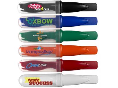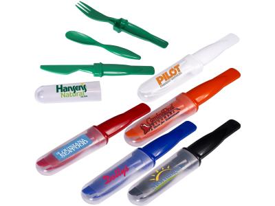 ABS plastic fork, knife and spoon fitted inside a transparent polypropylene cover. Dishwasher safe.