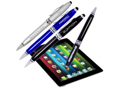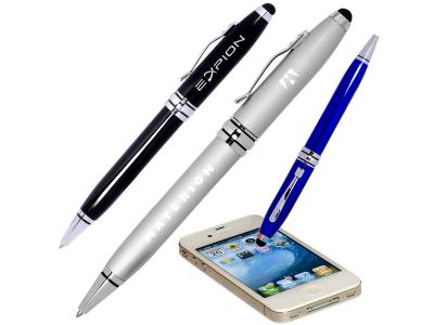 Aluminum twist-action ballpoint pen. Soft silicone tip for use with iPads, iPhones, tablets and other touchscreen devices.